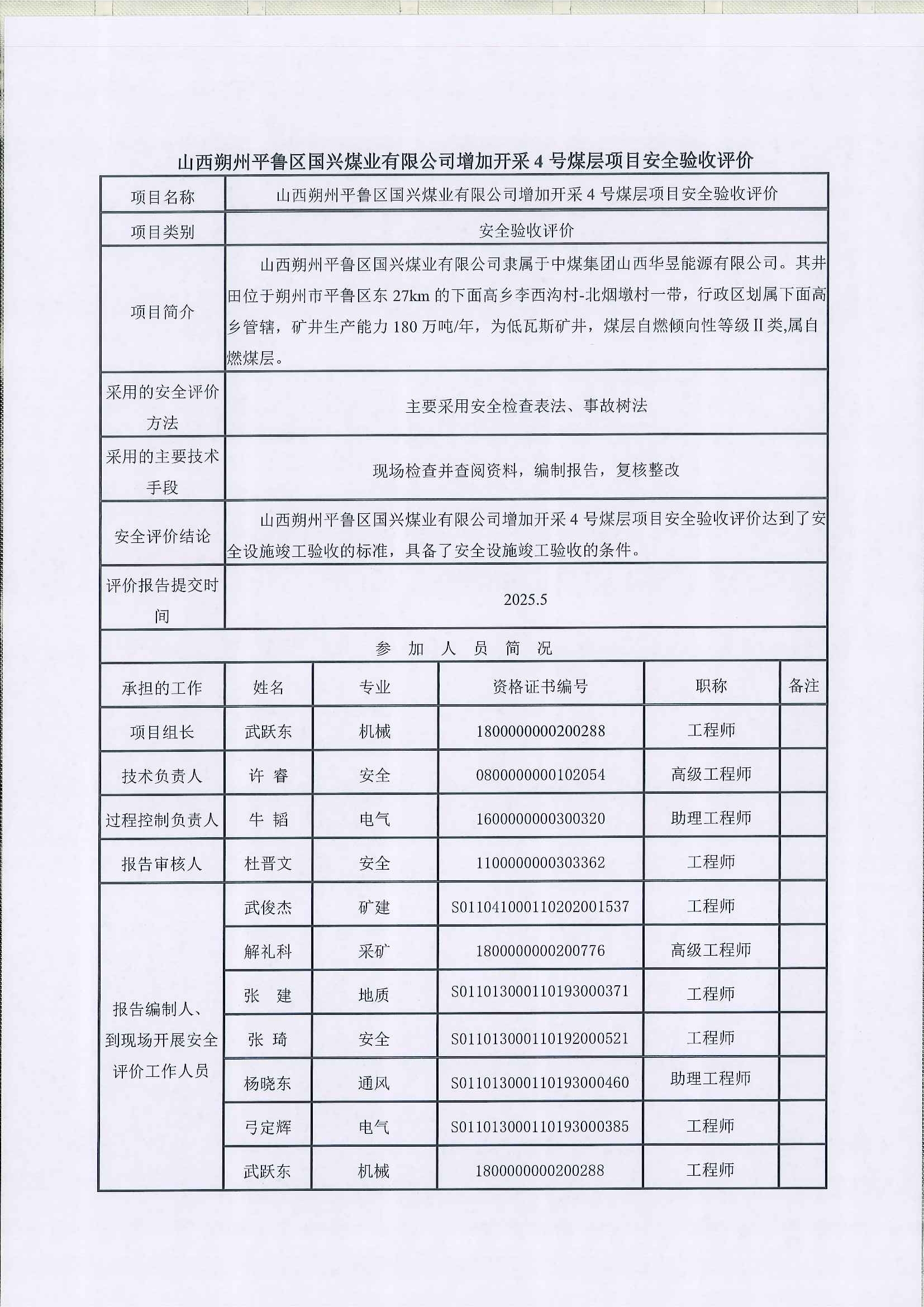 山西朔州平鲁区国兴煤业有限公司增加开采4号煤层项目安全验收评价