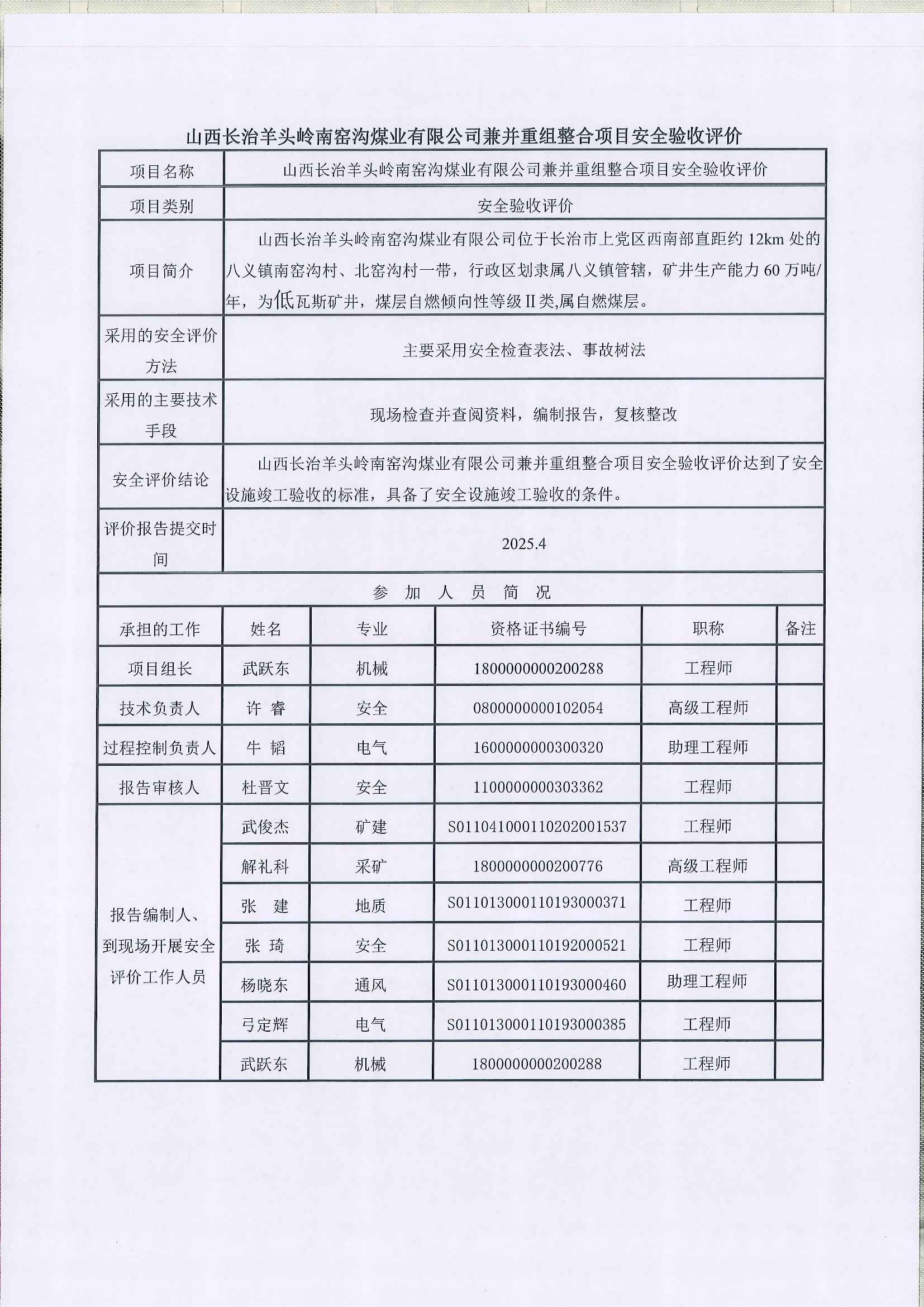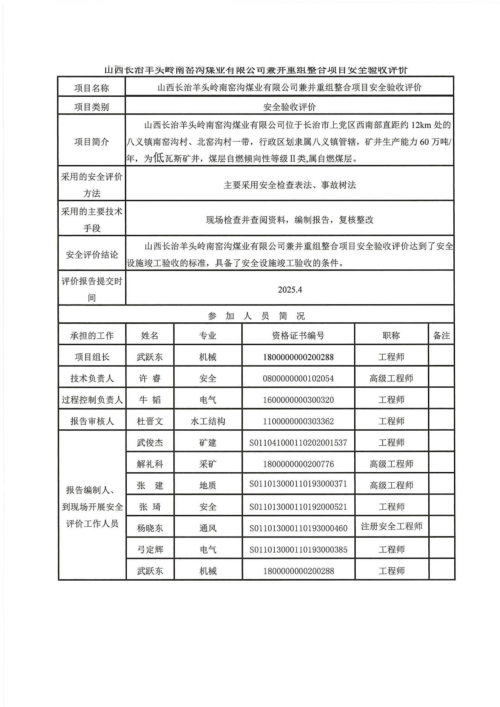 山西长治羊头岭南窑沟煤业有限公司兼并重组整合项目安全验收评价