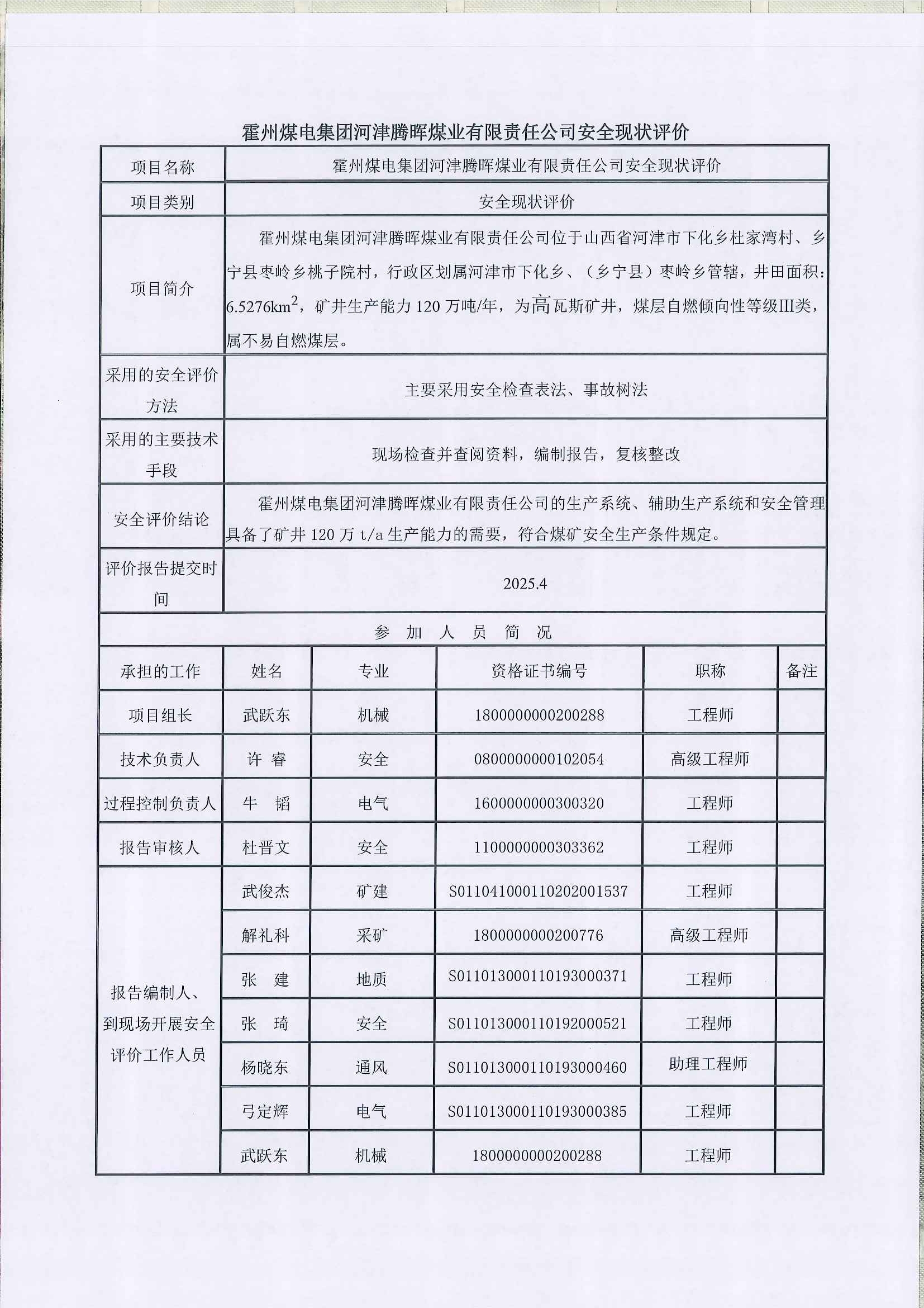 霍州煤电集团河津腾晖煤业有限责任公司安全现状评价