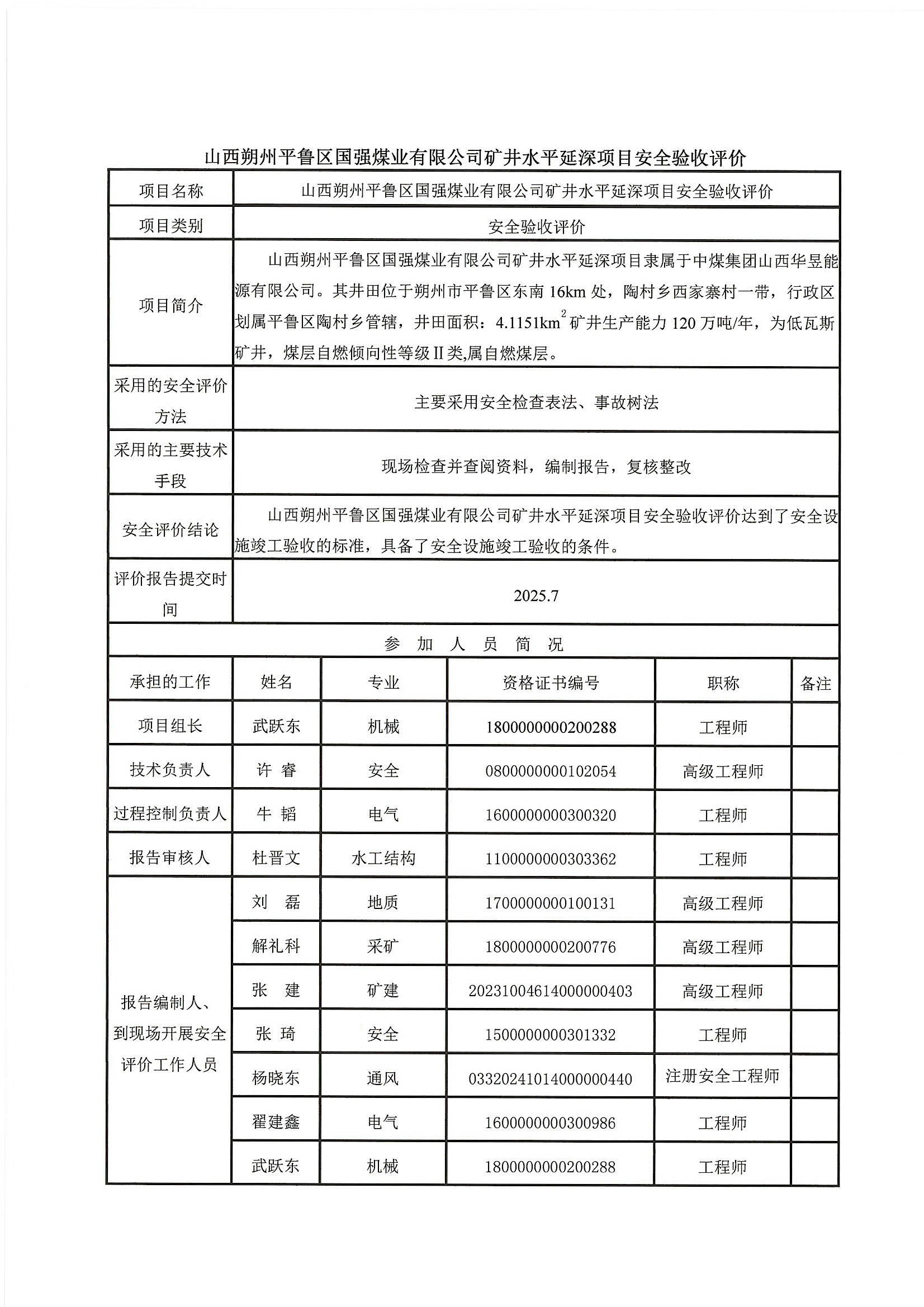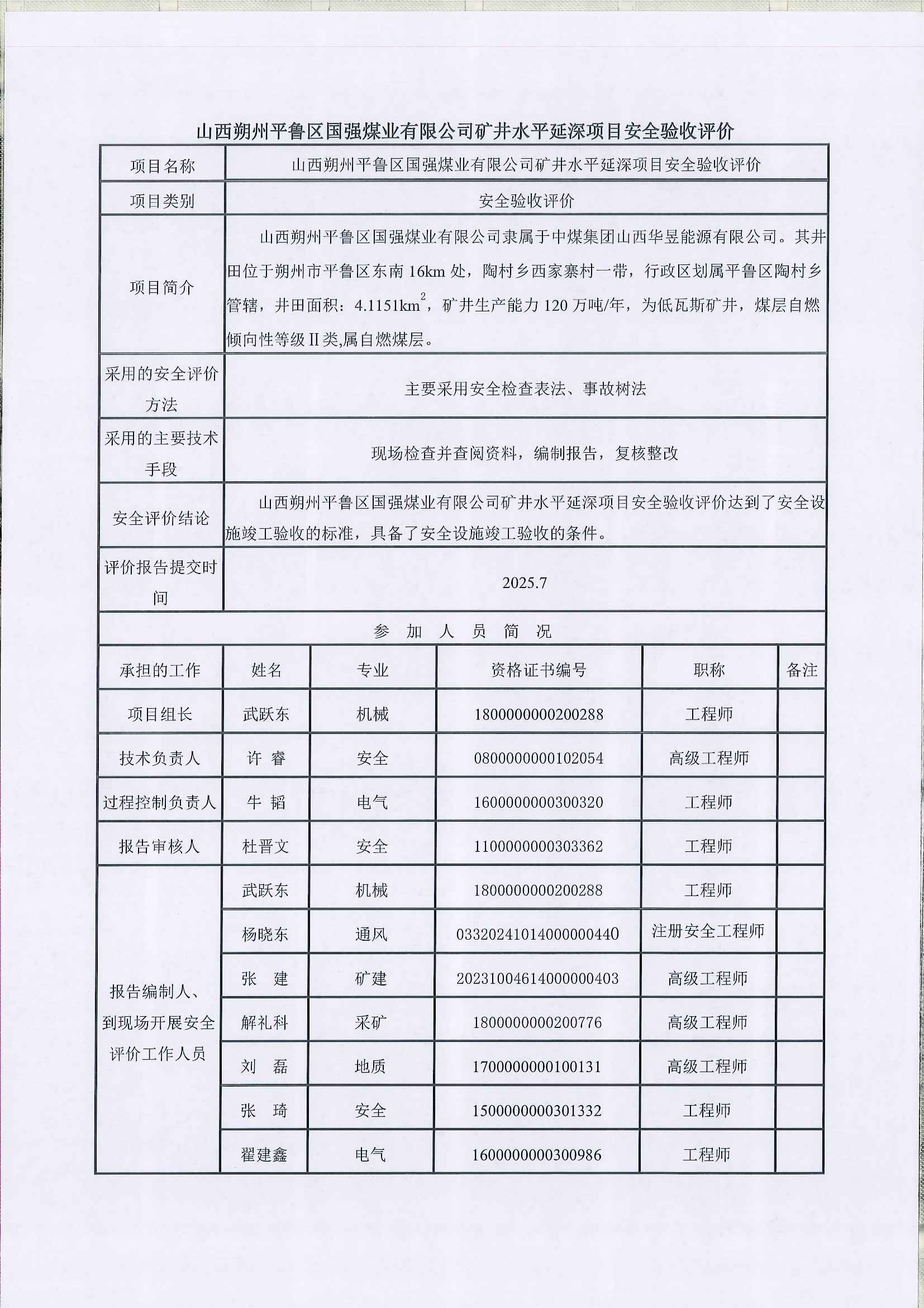 山西朔州平鲁区国强煤业有限公司矿井水平延深项目安全验收评价