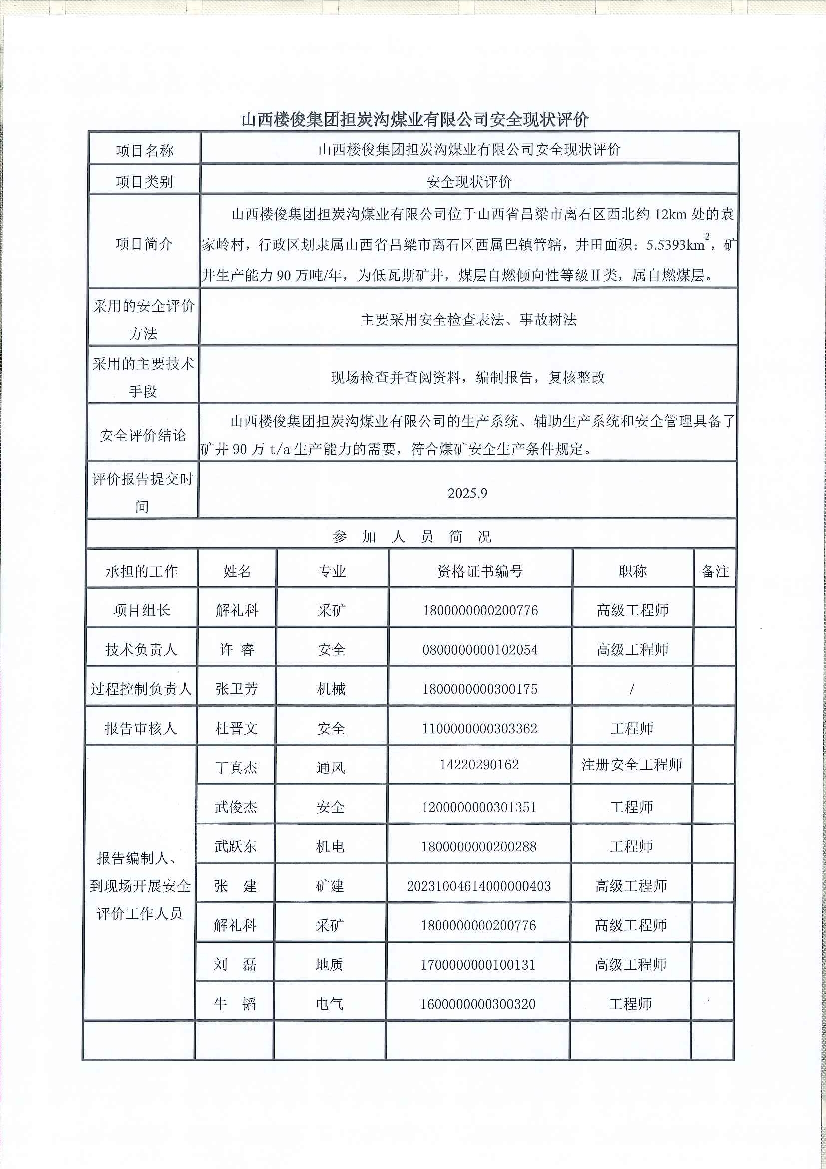 山西楼俊集团担炭沟煤业有限公司安全现状评价