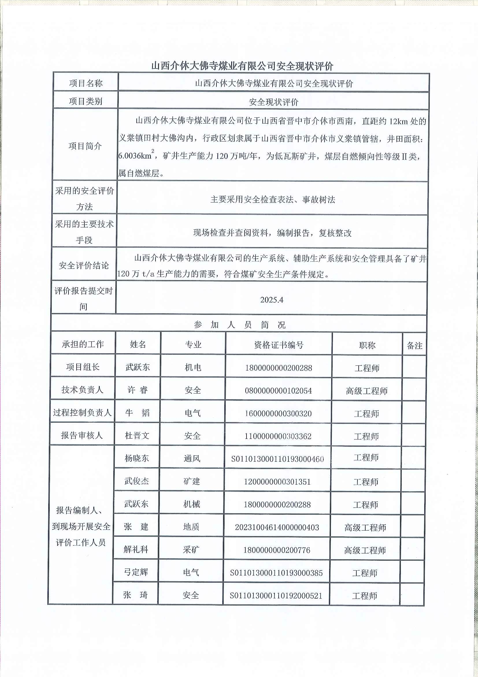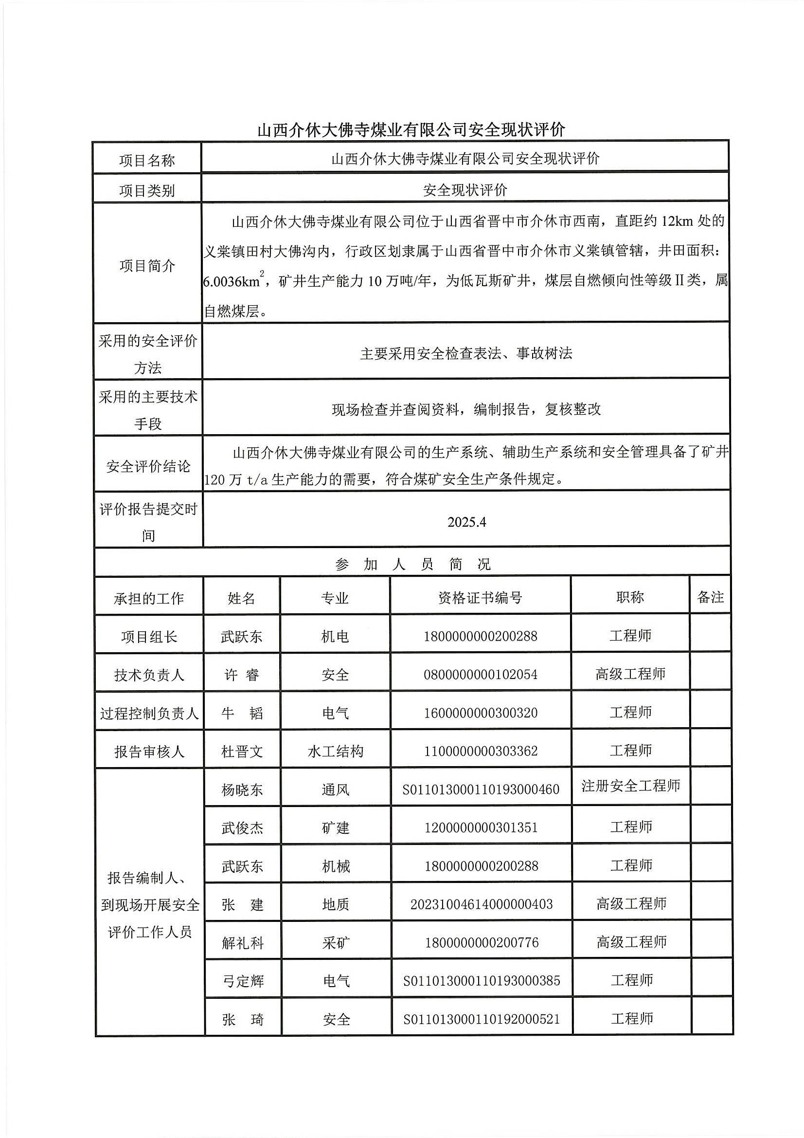 山西介休大佛寺煤业有限公司矿井安全现状评价