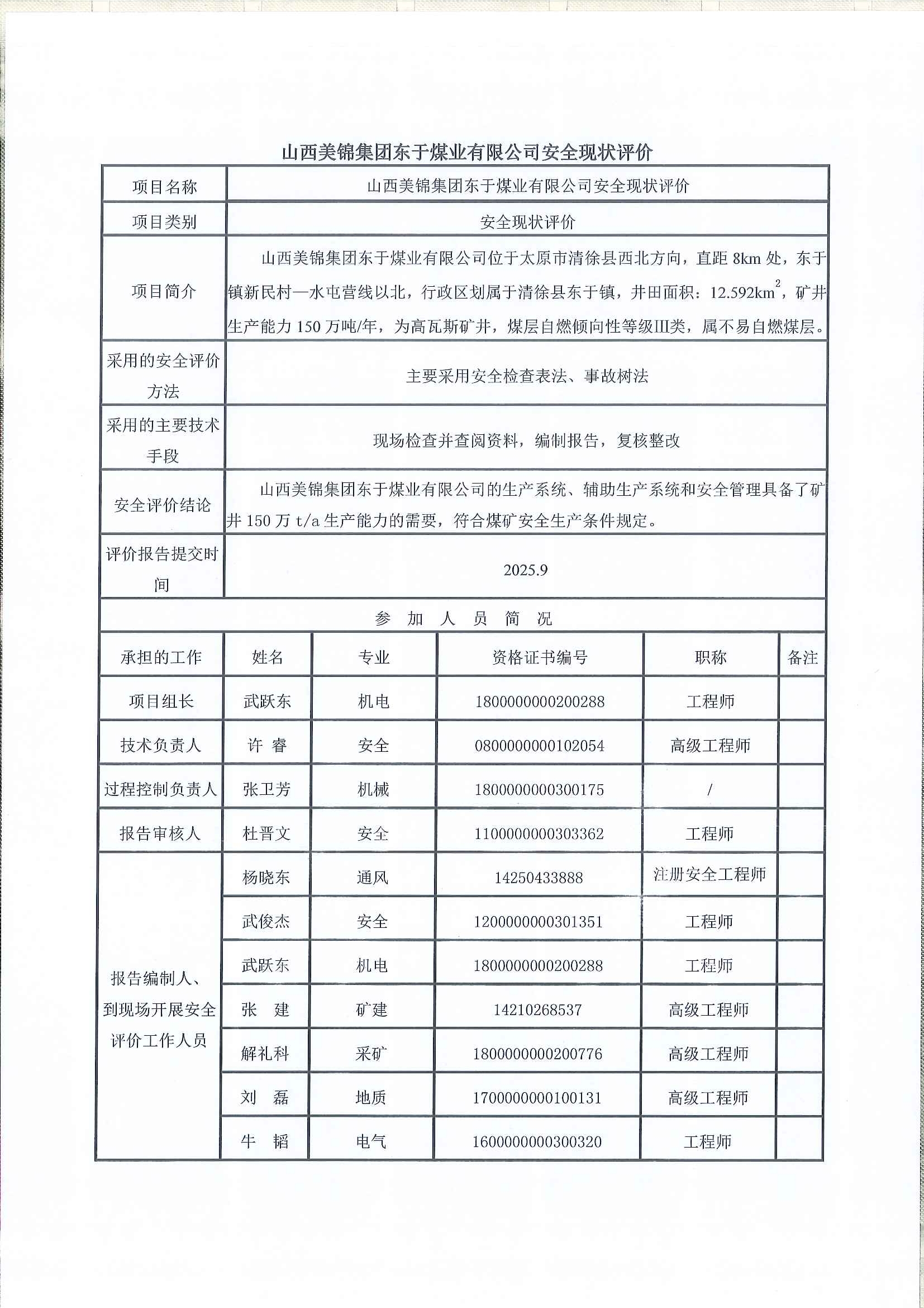 山西美锦集团东于煤业有限公司矿井安全现状评价