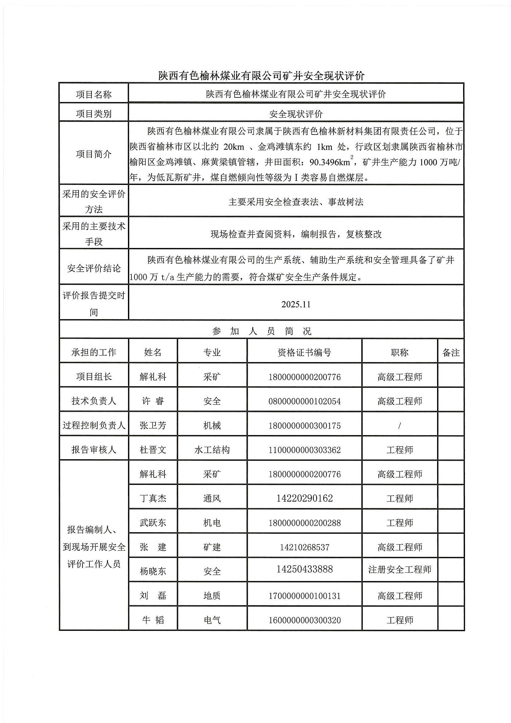 陕西有色榆林煤业有限公司矿井安全现状评价