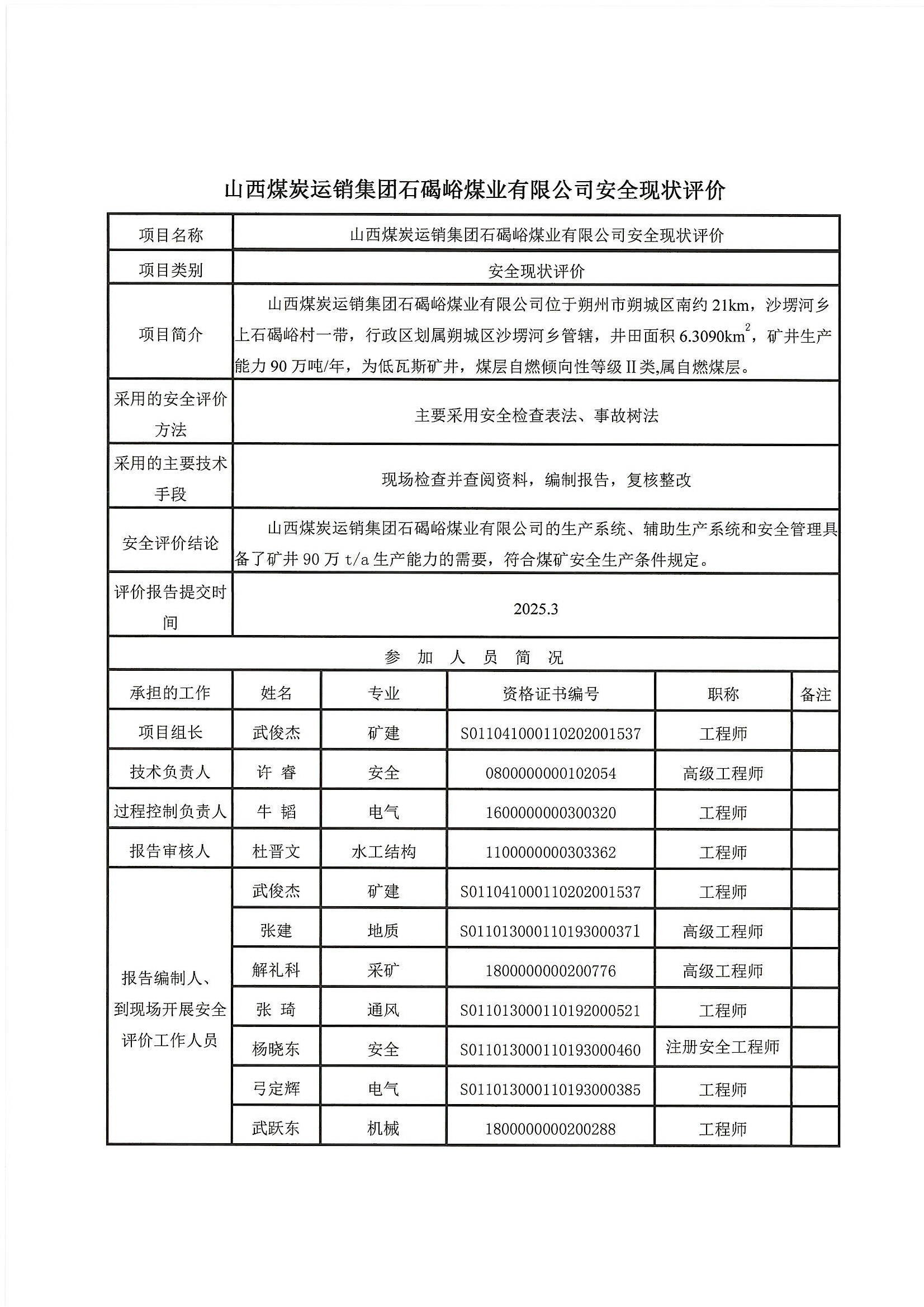 山西煤炭运销集团石碣峪煤业有限公司安全现状评价