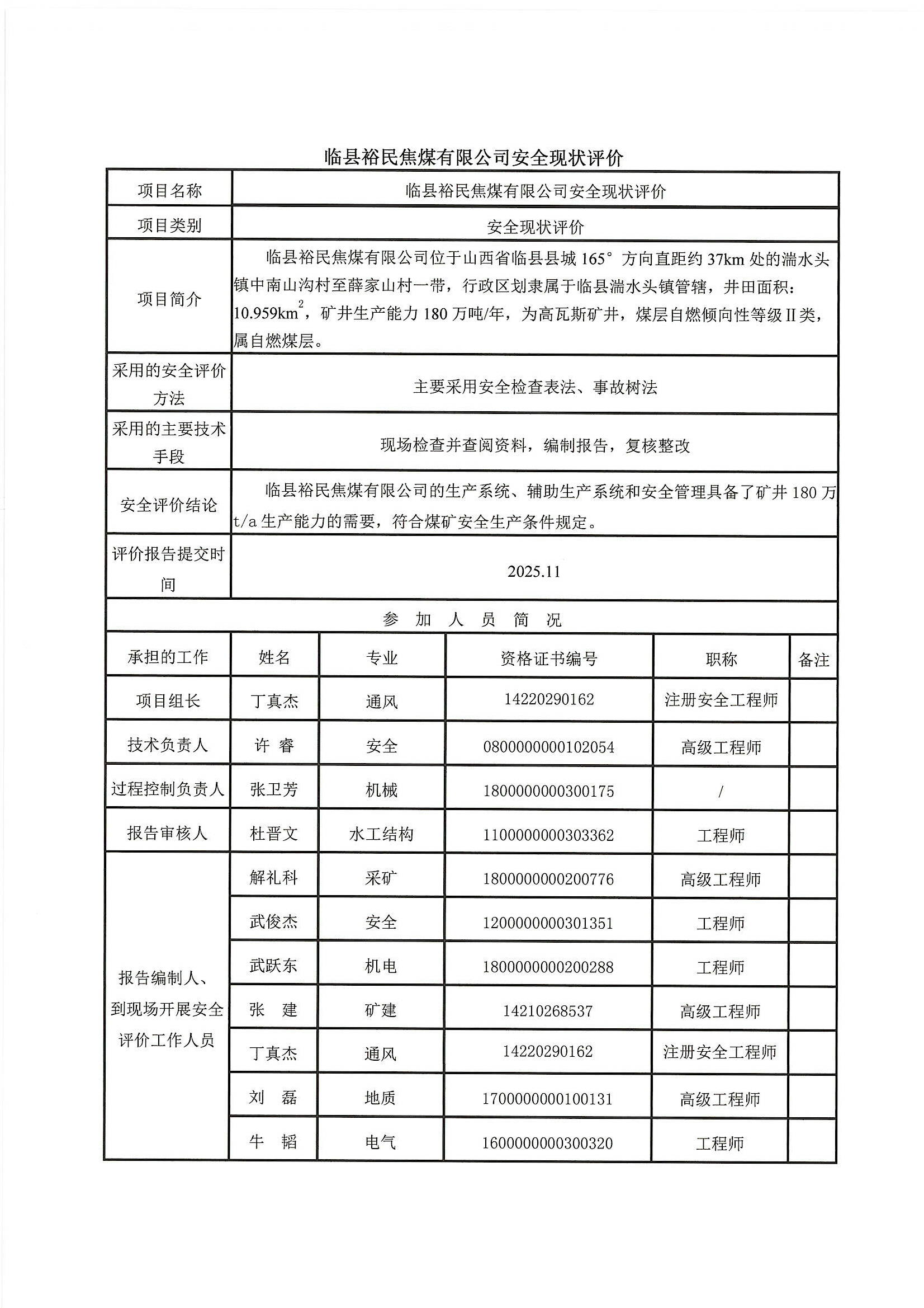 临县裕民焦煤有限公司矿井安全现状评价