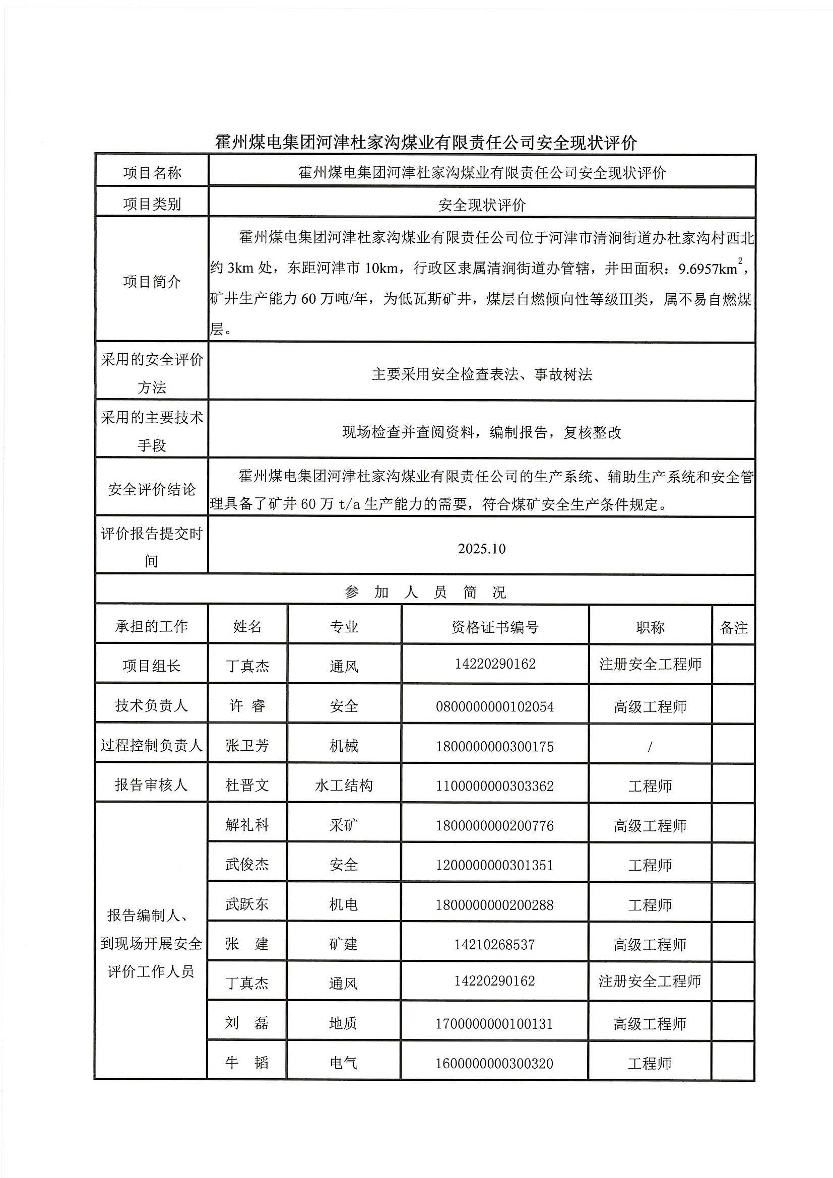 霍州煤电集团河津杜家沟煤业有限责任公司矿井安全现状评价
